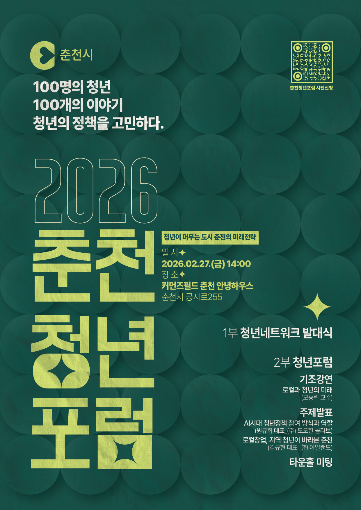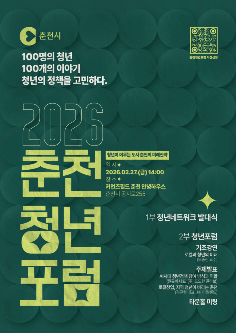청년네트워크 출범식 및 청년포럼 개최, 정책 참여 구조 공식화 제1기 위원 30명 위촉, 3개 분과 활동 본격화 춘천시(시장 육동한)가 27일 커먼즈필드 안녕하우스에서 ‘2026 춘천시 청년네트워크 발대식 및 청년포럼’을 개최한다. 시는...