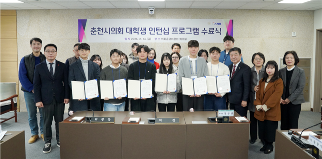 춘천시의회(의장 김진호)가 13일 오전 춘천시의회 의회운영위원회 회의실에서 대학생 인턴십 프로그램의 활동을 마무리하는 수료식을 개최했다. 이번 인턴십 프로그램은 강원대학교 정치외교학과와의 업무협약(‘26. 1. 13.)을 통해 학부생 6명을 대상으로 진행됐으며, 지난 1월 19일부터...