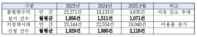 지정게시대 신청은 2023년 2만 3,144건, 2024년 2만 2,554건, 올해 9월까지 1만 9,040건으로 나타나 합법적 게시문화가 점차 확산되는 추세다. 불법현수막은 감소세를 보이고 있지만 주요 교차로 등 일부 구역에서는 상습적인 게시 행위가 이어지면서 도시 미관을 해치고 보행 안전을 위협한다는 민원이 잇따르고 있다.
