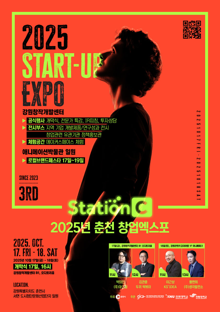 17~18일 서면 도시첨단문화산업단지서 개최 투자 IR·강연·시민참여까지…45개 부스 운영 Station C 얼라이언스’ 결성식, 창업지원 협력 공식화 춘천시가 창업생태계의 힘을 한자리에 모은다. 춘천시(시장 육동한)는 오는 17~18일 이틀간 서면 도시첨단문화산업단지 일원에서 ‘2025 제3회...